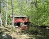 A wooden waterwheel spins beside a pond. A red covered bridge spans a rippling brook. Moss and lichens decorate imposing rock formations. A serpentine boardwalk wends its way through a green wetland, and birds flit from the railings to the tall trees above while sunlight glints on the water below. A sandy beach stretches beside a deep blue pond edged with pine trees. Trails marked by colored blazes head off into woods concealing enticing remnants of the past.