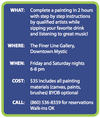 Participants are strongly encouraged to reserve their space although walk-ins are welcome. This event is perfect for social outings - Date Night, Girl’s Night Out, Employee Get-Togethers - and offers a great opportunity to meet new friends. No painting experience is necessary.