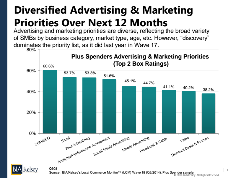 60% of small and medium-sized businesses (SMBs) view SEO and pay-per-click advertising as their top marketing priority for the next year, according to research from BIA/Kelsey on a group known as “SMB Plus Spenders” – businesses that spend more on marketing and advertising than typical SMBs. The second highest priority for these SMBs is email marketing.