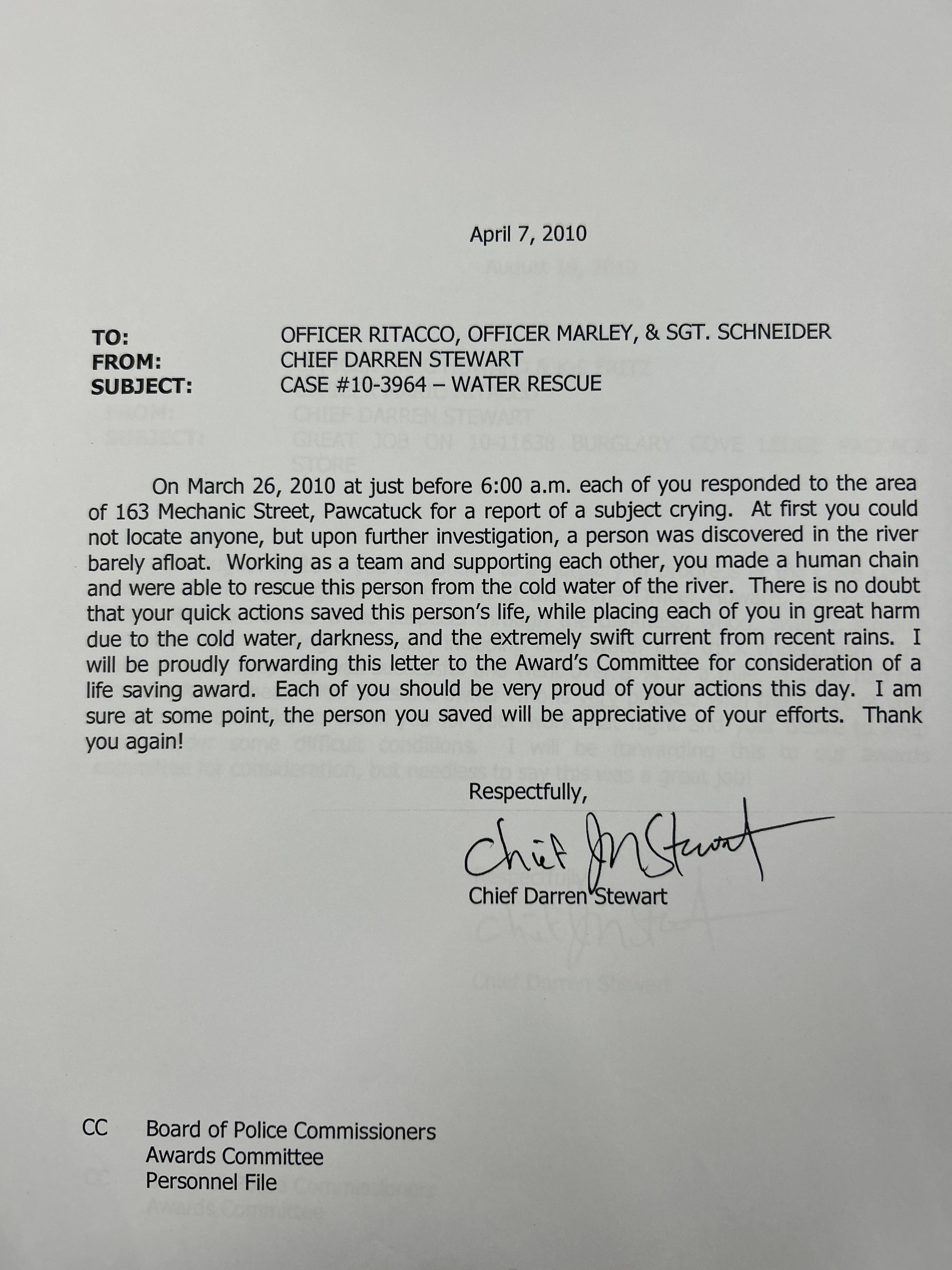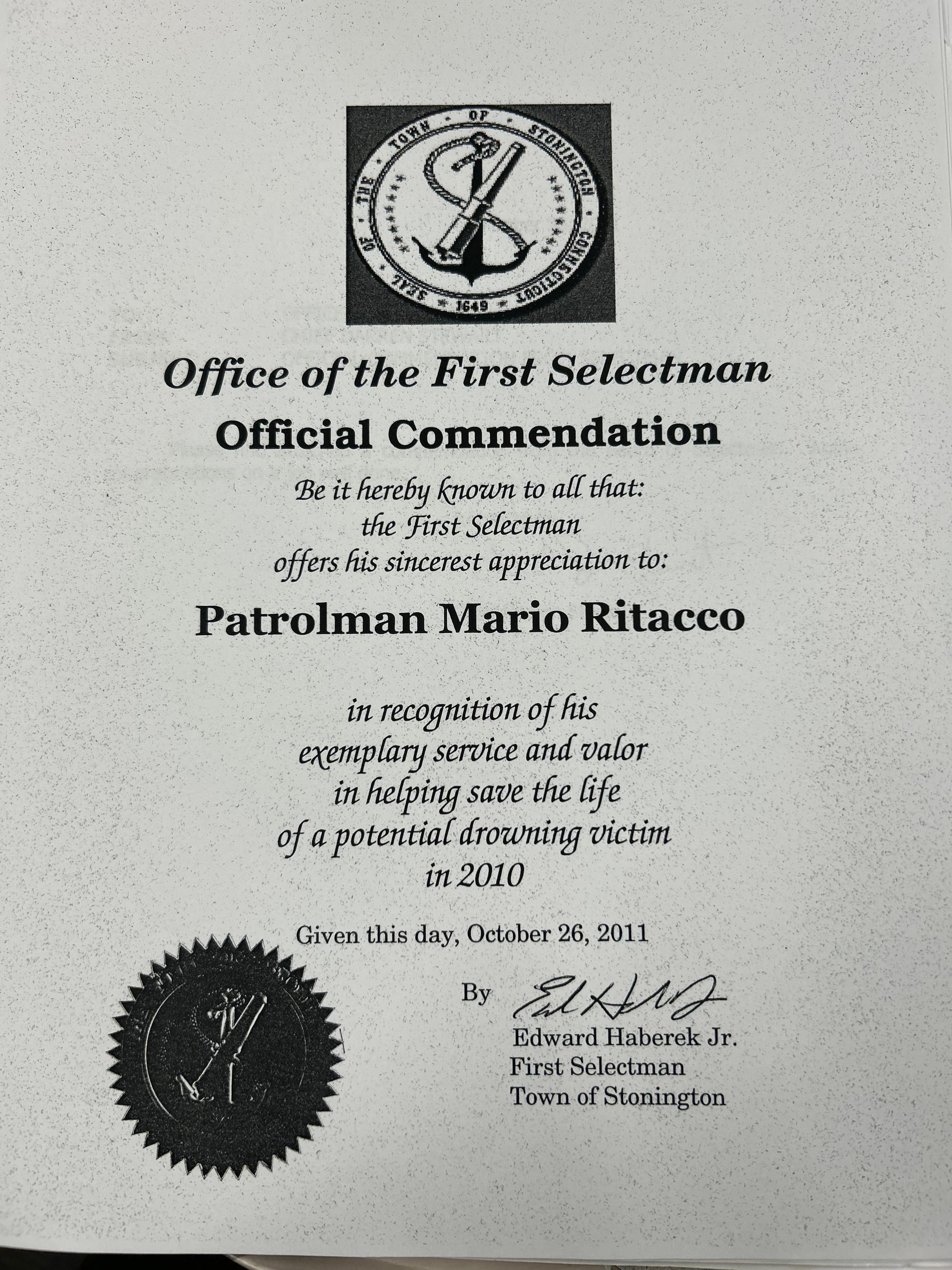 In the winter of 2010 at 5 a.m. while on patrol, Ritacco and two other officers headed to Mechanic Street after a resident reported they heard someone crying for help in the Pawcatuck River. Using flashlights, the officers found a man with a rope tied around his neck struggling in the water off of a dock. Then-chief Darren Stewart said that before waiting for other first responder help, the three officers created a human chain by holding on to each other's gun belts and were able to rescue the man. The Connecticut Police Chiefs Association awarded then-Sgt. Bryan Schneider, then-Youth Officer Tim Marley and then patrol officer Ritacco the Medal of Valor.