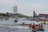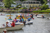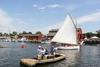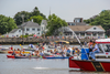 Anne was already in position, anchored near the whaler so we took a small boat out and settled in to watch the crowded Mystic River. Kayaks and rafts huddled around Anne, canoes tied up to her as well as other boats. We watched the police boats and fire boat patrol the area and heard the announcement that the fireboat would be spraying water.