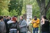 What started as a small gathering of a handful of protestors shortly after 8 a.m. Wednesday morning had swelled to a large and vocal group that numbered close to a hundred less than an hour later — and the movement showed no signs of losing steam as the morning wore on and more and more people seemed to be drawn to the crowd.