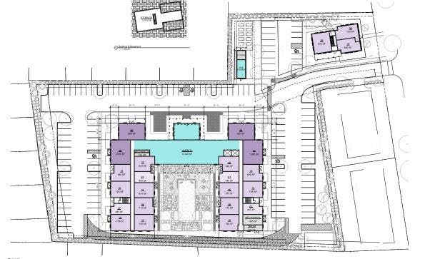 The proposed structure will be 93,000 square feet, but will be located in the center of the property, set back from the street. It will include a roughly 5,500-square-foot amenity area and 97 apartments, which will range in size from about 500 square feet to about 1,200 square feet. The project will also have a 6,500-square-foot two-story building with an additional six units.