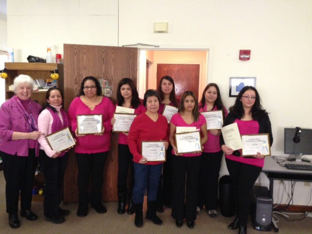 Bridgeport, CT January 2013 – Eight ladies dressed in pink graduated from Caroline House after completing Level Four of their ESL classes. All the other students of Caroline House were “tickled pink” because they were promoted to the next Level in learning English.