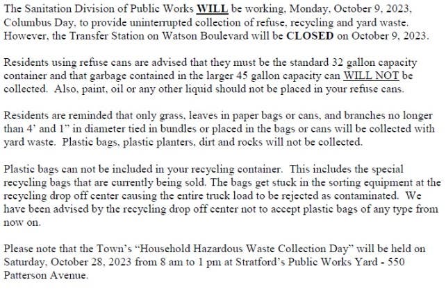 Officials announce the schedule for town buildings and trash collection for the Columbus Day holiday.
