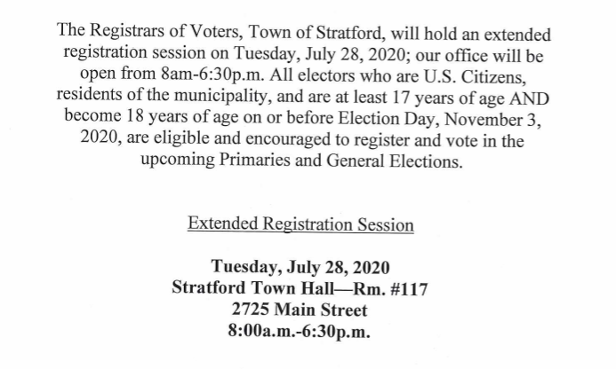 All Stratford residents who are U.S. citizens and will be 18 on or before Nov. 3 are eligible to register and vote.
