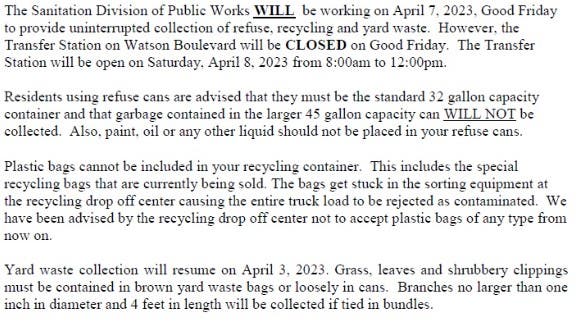 Officials announce the schedule for town buildings and trash collection for the Good Friday holiday.