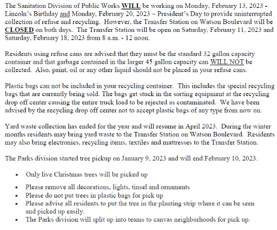 Officials announce the schedule for town buildings and trash collection for the Lincoln's Birthday and Presidents' Day holidays.