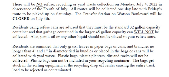 Officials announce the schedule for town buildings and trash collection for the Independence Day holiday.