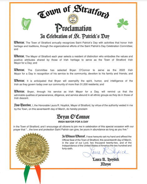 STRATFORD, CT — Mayor Laura R. Hoydick issued the following proclamation recognizing Bryan O'Connor as Stratford's Irish Mayor for the Day from Thursday's St. Patrick's Day festivities.