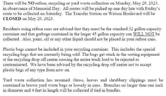 Officials announce the schedule for town buildings and trash collection for the Memorial Day holiday.