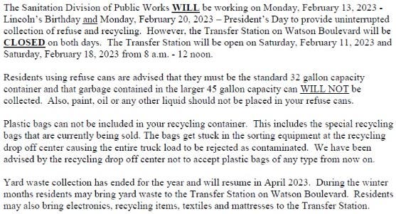Officials announce the schedule for town buildings and trash collection for the Presidents' Day holiday.