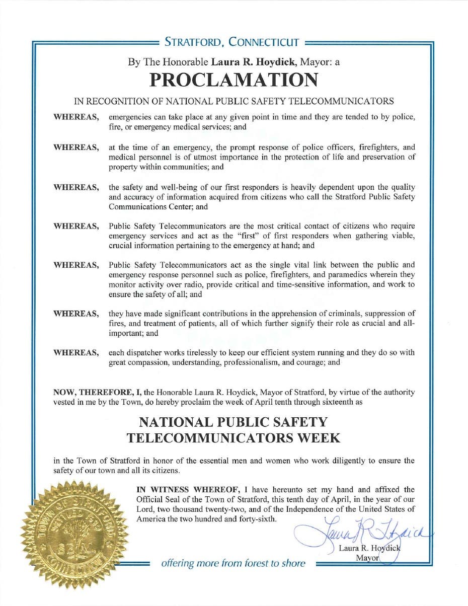 STRATFORD, CT —Stratford Mayor Laura R. Hoydick released the following proclamation in recognition of National Public Safety Telecommunicators Week.