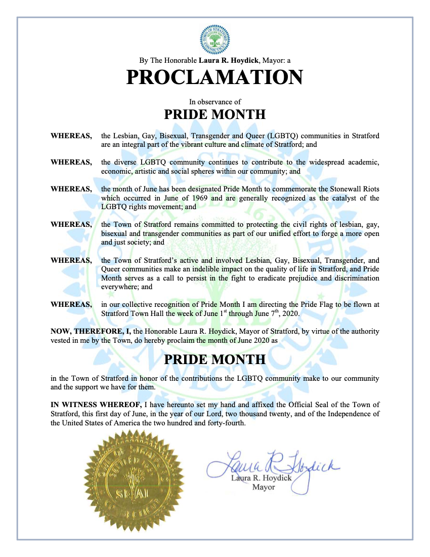Below please find proclamation for Pride Month in the Town of Stratford.