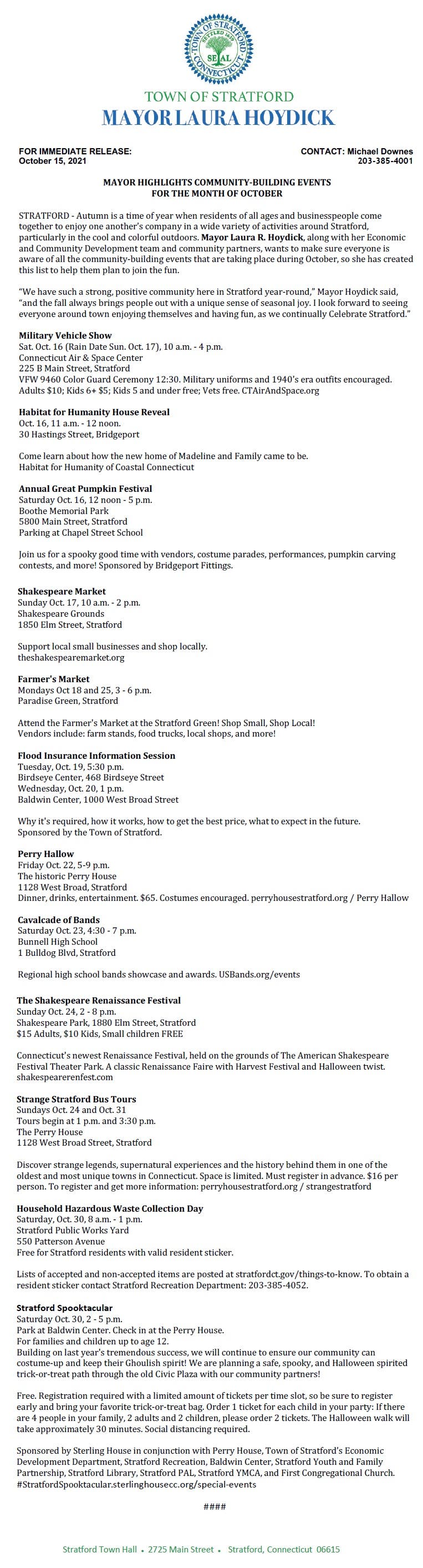Town Of Stratford: Mayor Highlights Community-Building Events For The Month Of October