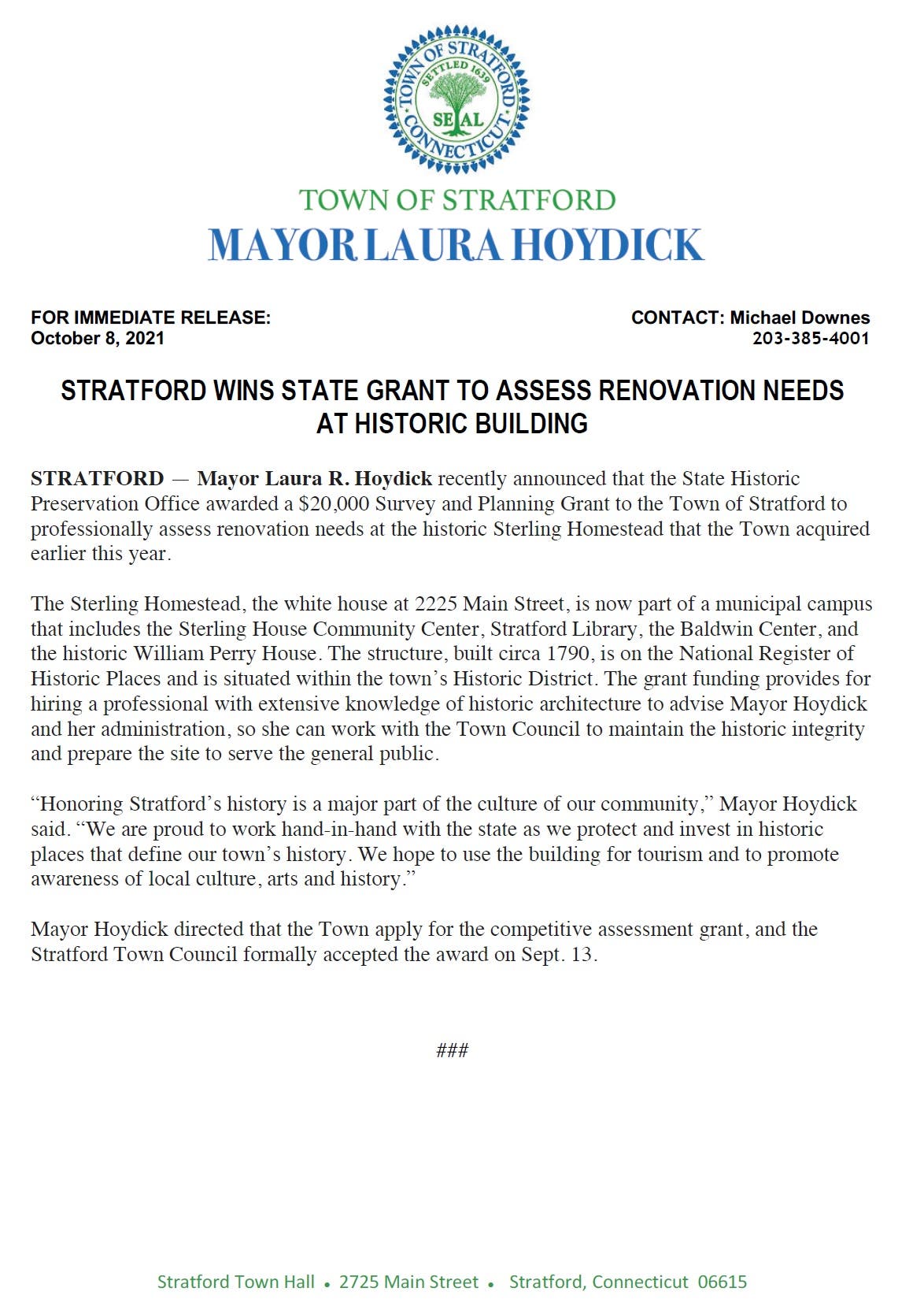 Town Of Stratford: Stratford Wins State Grant To Assess Renovation Needs At Historic Building
