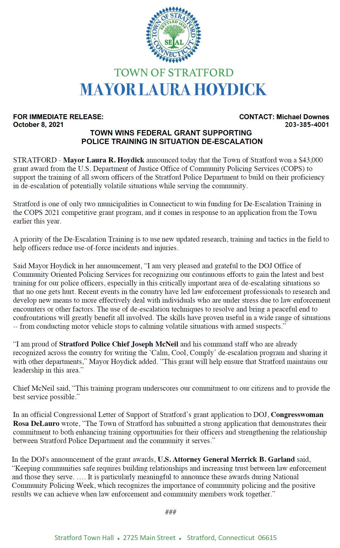 Town Of Stratford: Town Wins Federal Grant Supporting Police Training In Situation De-Escalation