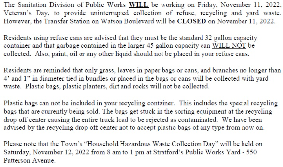 Officials announce the schedule for town buildings and trash collection for the Veterans Day holiday.