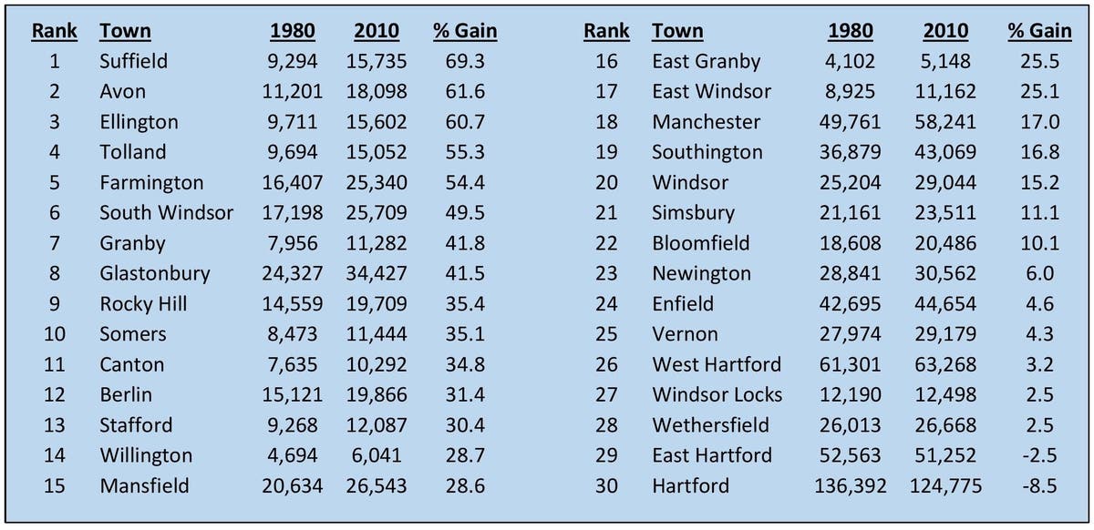 Patch editors in Hartford and Tolland counties examined population records for the 30 towns covered in that region, provided by the Secretary of the State's office, to see which communities experienced the largest growth, by percentage, from the 1980 census through the most recent tally in 2010.