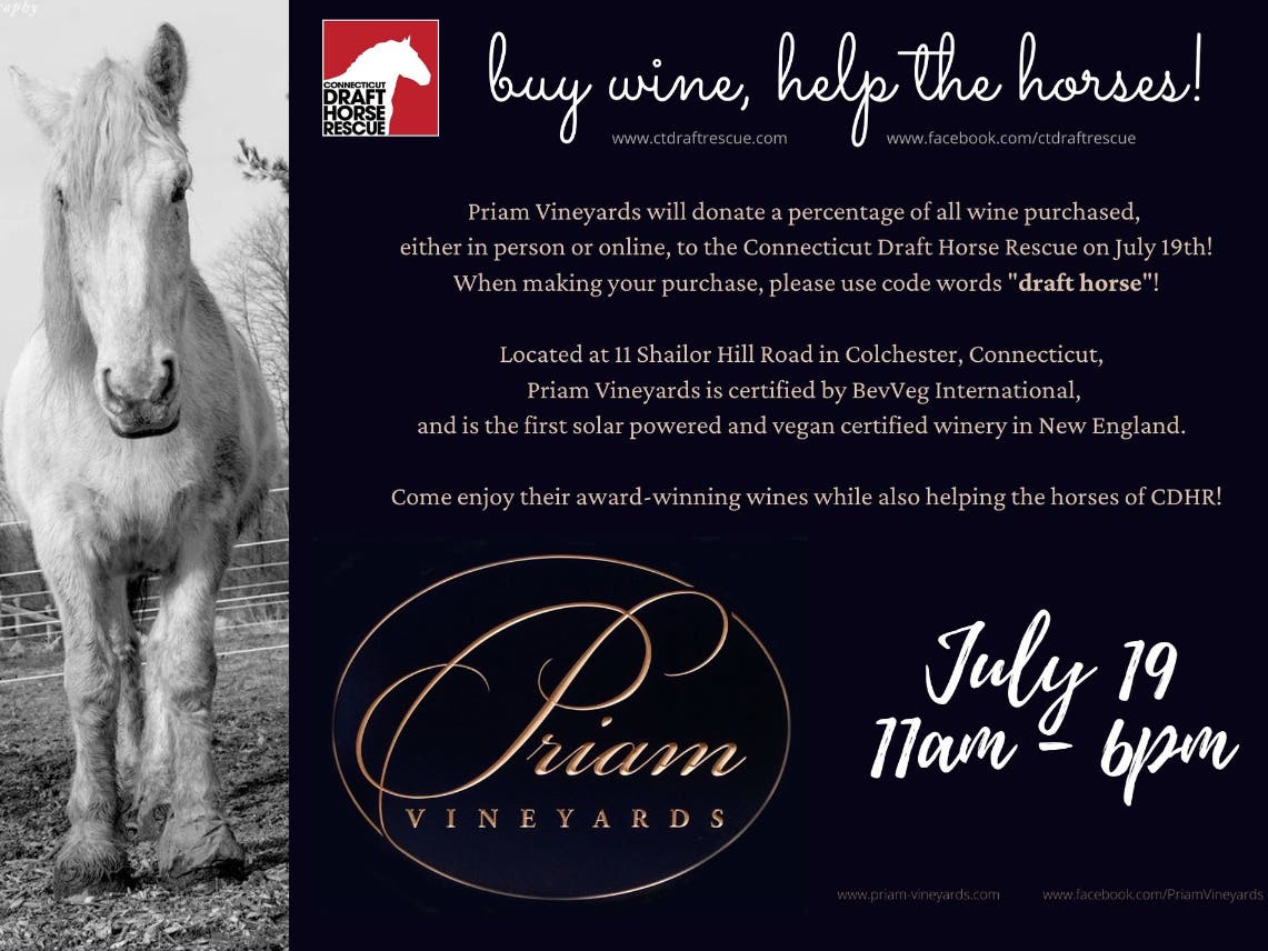 Priam Vineyards will donate a percentage of all wine purchased to the CT Draft Horse Rescue on July 19th from 11am-6pm! When making your purchase (in-person or online at www.priam-vineyards.com), please use code words β€œdraft horse”. Come enjoy their award-winning wines while helping the horses of CDHR!