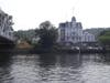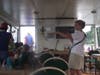 Mark blows the horn as the boat floats under the bridge, then points out the Nathan Hale School House on the bank of the river.