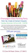 Create a pair of champagne glasses to ring in the New Year! Learn the art of painting on glass while designing a pair of champagne glasses with the help of talented Art Truck staff. We provide everything needed so you can enjoy a fun, creative evening with friends! Wine tastings and dinner will be available (additional fee) at Chamard Vineyards - French Inspired Wines from the Connecticut Shoreline.