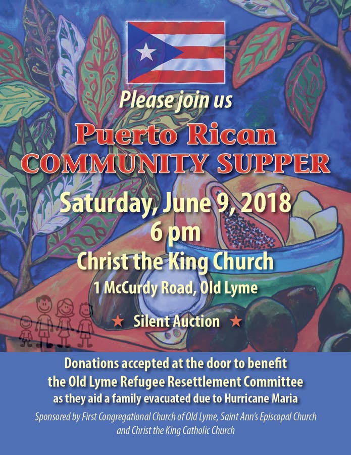 First Congregational Church of Old Lyme (FCCOL), Christ the King Church and Saint Ann's Episcopal Church are banding together to host the supper at 6 p.m. on the 9th at Christ the King Church on McCurdy Road in Old Lyme. The event will feature "traditional Puerto Rican music and delicious dishes."