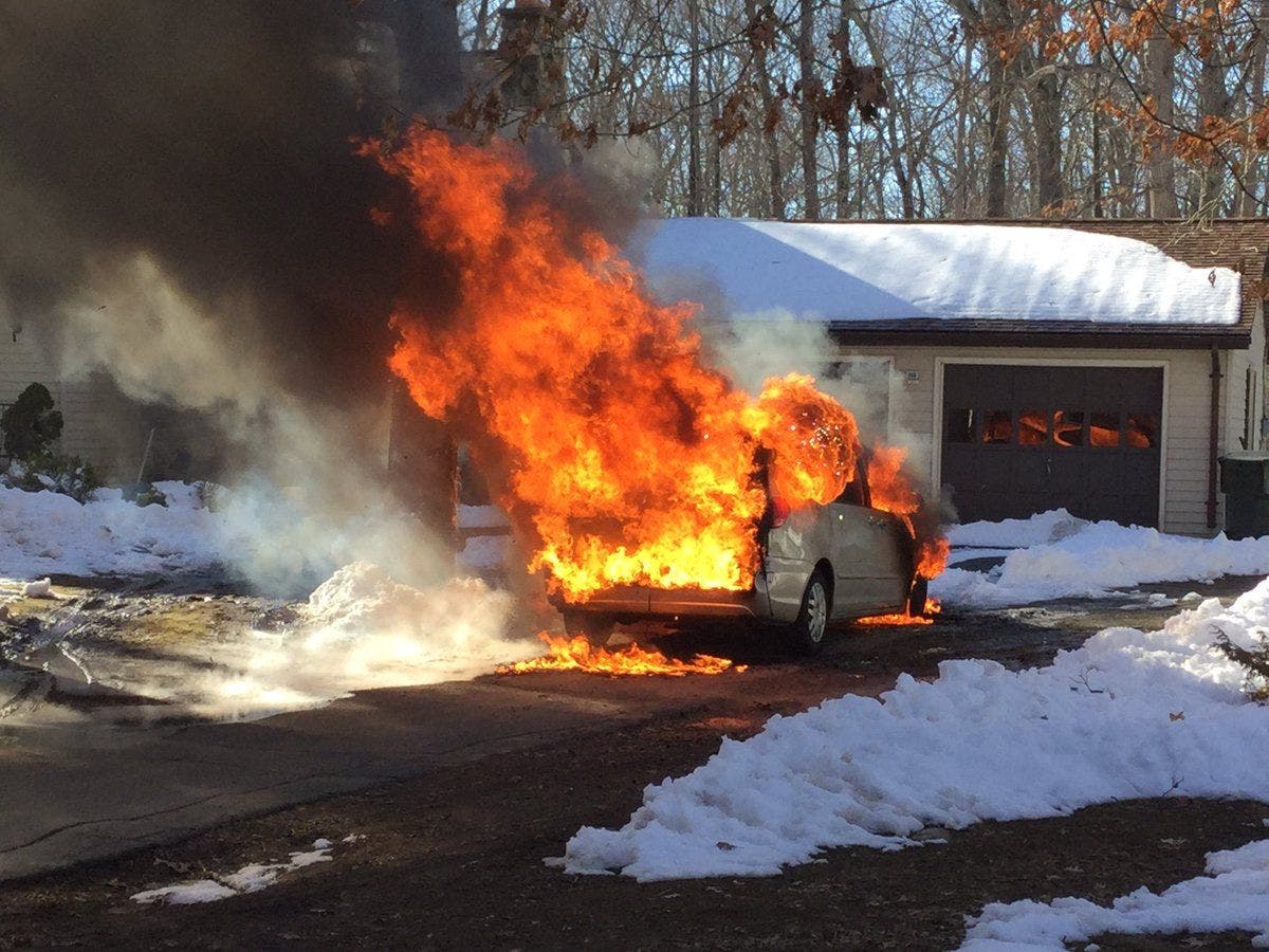 TOLLAND, CT — Firefighters responded to a Shanda Lane driveway on Sunday afternoon for a car that had burst into flames.