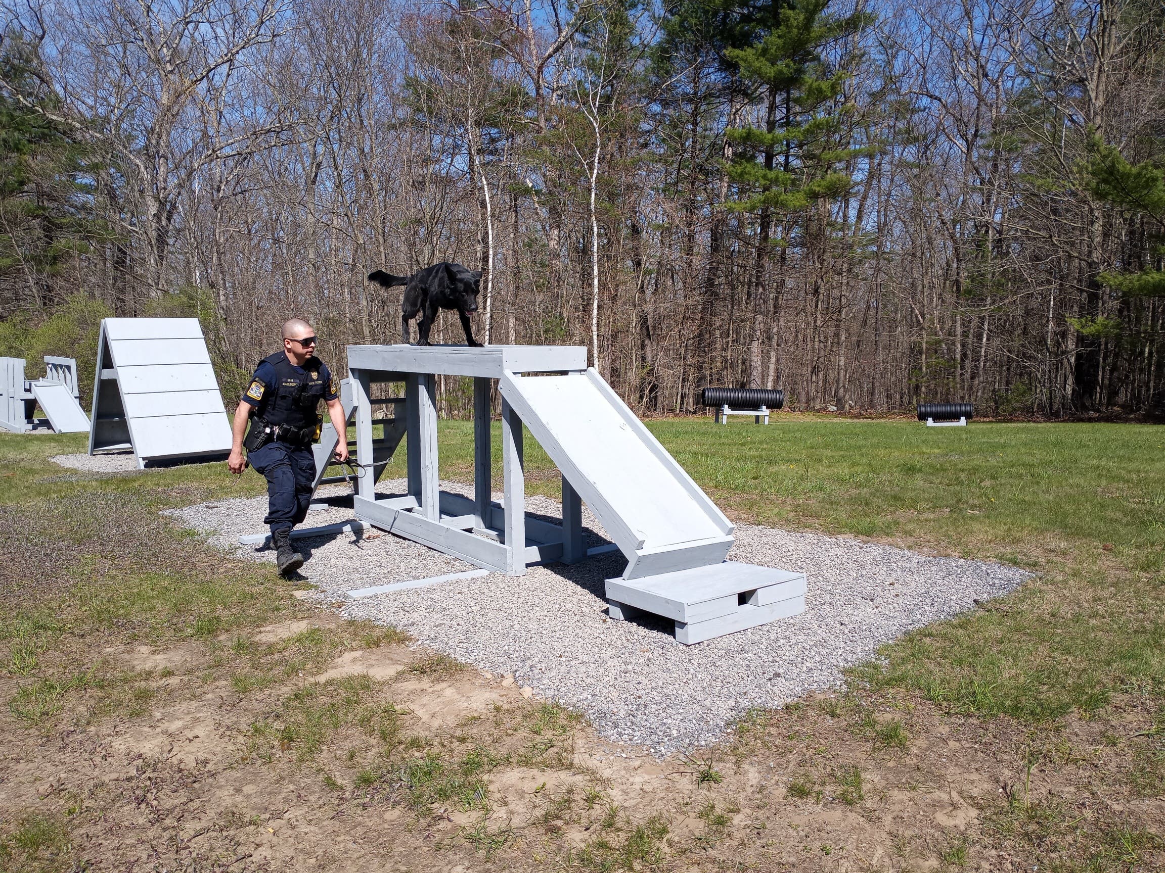Drago's vest and leash were placed at the sign of the new canine obstacle and training course, which he, Kaelberer and a local Eagle Scout helped design.
