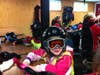 While I filled put the paperwork, Cassidy joked with Grace and made her feel comfortable. She also made the boots comfortable. Grace was also fitted with a good pair of Elan learning skis and a helmet. First-timers do not use poles.