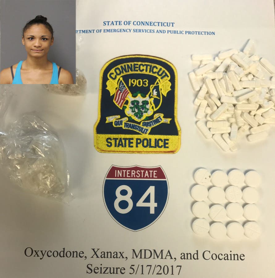 Troopers seized the cocaine and took her into custody, according to a report. A further search uncovered more than 90 Xanax prescription pills, 16 Oxycodone pills, approximately 5 grams of cocaine, 5 grams of MDMA or "Molly" and 50 grams of marijuana, according to a report.
