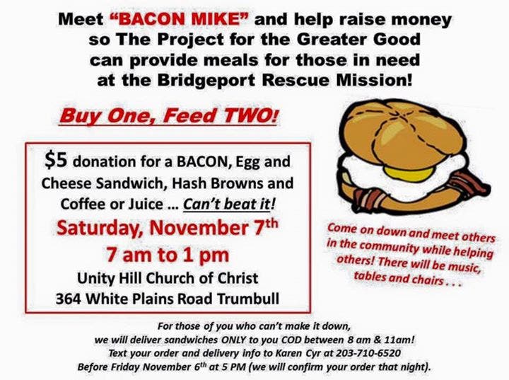 A fundraiser is being held at Unity Hill Church of Christ at 364 White Plains Road. $5 gets you a bacon, egg and cheese sandwich, hash browns and coffee or juice.