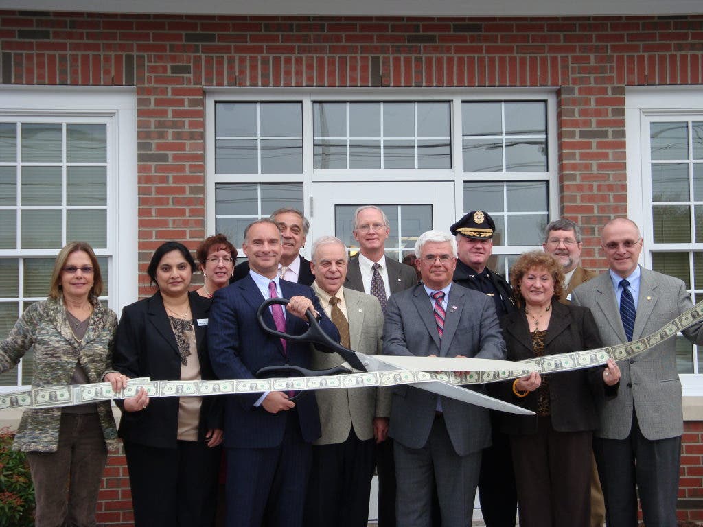 In a twist on a traditional ribbon cutting ceremony, local business, community, and government leaders today cut a ribbon of $1 bills at a Grand Re-Opening of Rockville Bank’s new Lafayette Square branch at 20 Hyde Avenue in Vernon, Conn. The newly built office was constructed in the same location as the building that was demolished in May. This past January, Rockville Bank closed its Lafayette Square office because of roof damage related to the region’s record heavy snow. Since then, a temporary Lafayette Square branch had been open at a nearby location in the former Tim Hortons shop.
