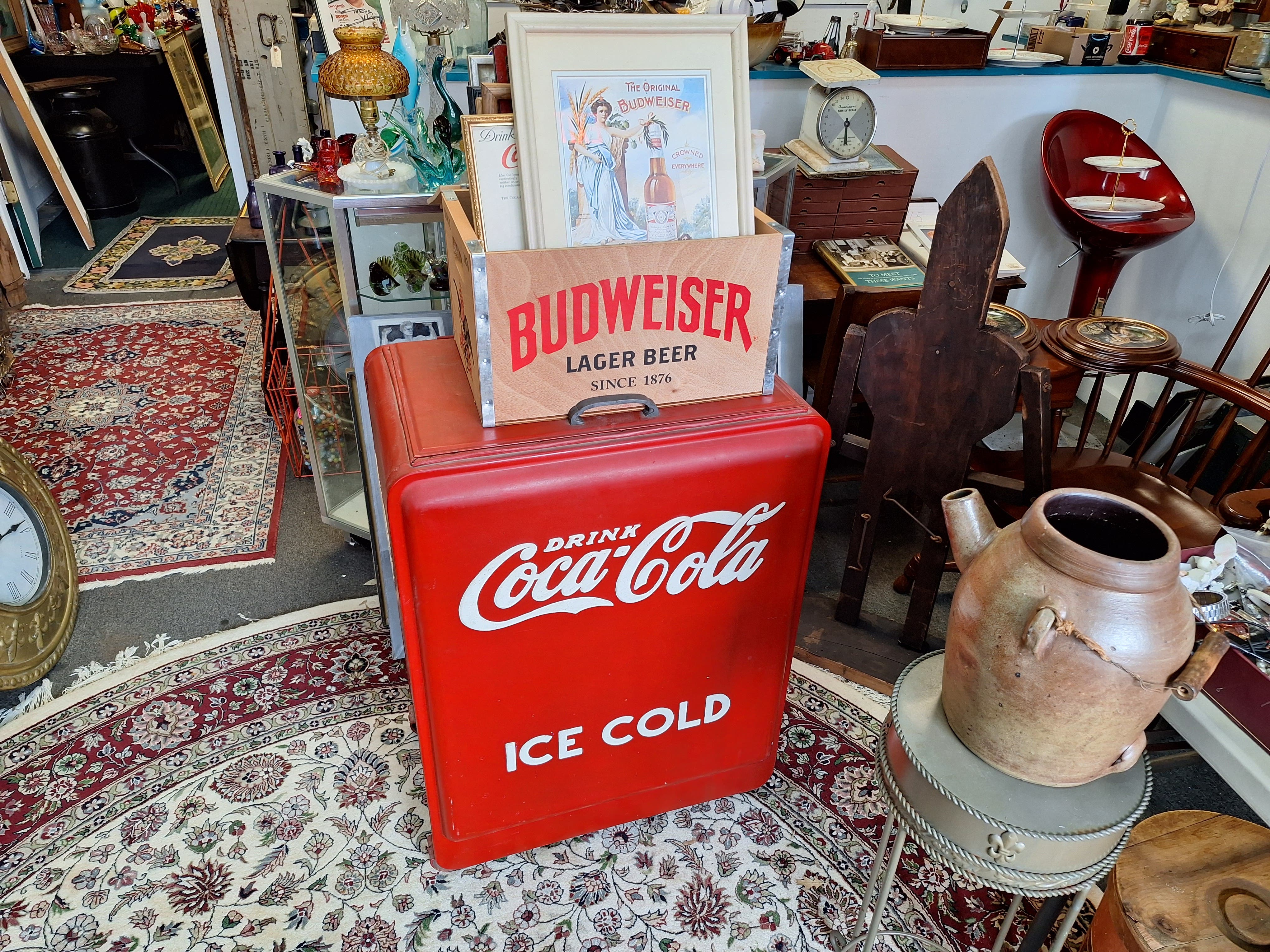 Richard Harris is joined by items like an old-time Coca-Cola cooler and a wooden Budweiser beer case, vintage and quite workable fishing poles, a variety of glassware, advertising displays and artwork.
