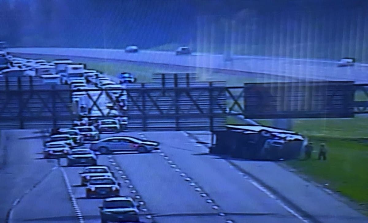 The report places the crash at 8 a.m. on the westbound lanes, just shy of the Exit 65-64 interchange. The truck, owned by K Transport out of Palm Coast, FL; was in the left of three lanes when it veered to the right and hit a 2015 Jeep Cherokee in the center lane, according to the report.
