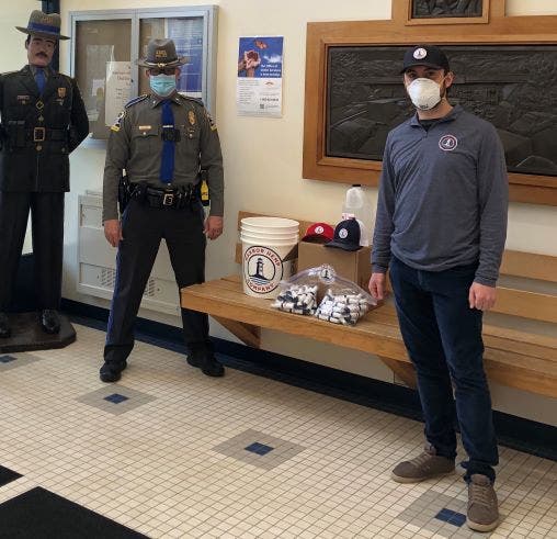 Harbor Hemp Company representatives were on-hand at Vernon police headquarters Tuesday morning to drop off several cases of sanitizer in spray bottles and 8 gallons worth of refills. Stops were also made at the state police Troop C barracks in Tolland and the North Coventry Fire Department.
