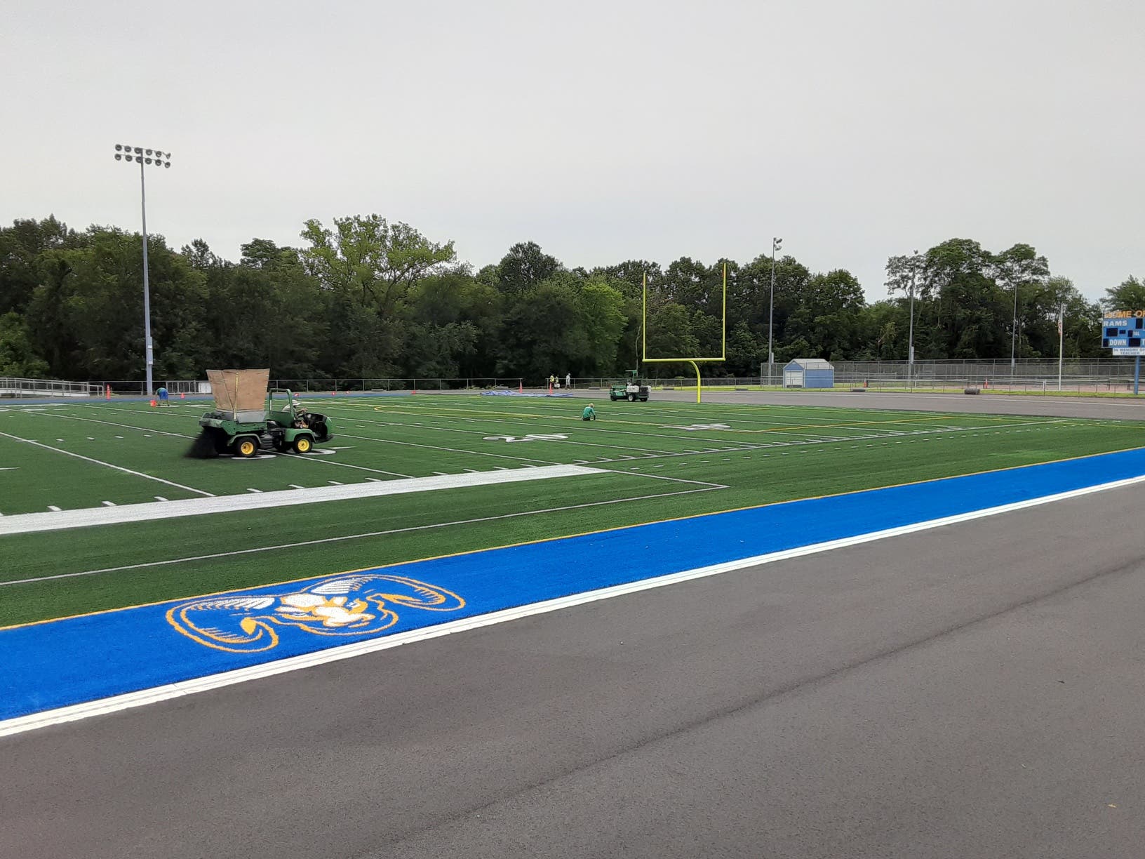VERNON, CT — With the Ram logo and piping now in place on the sidelines, a large R in the center of the field and the mulch put down, the new artificial turf field at Rockville is just about ready.
