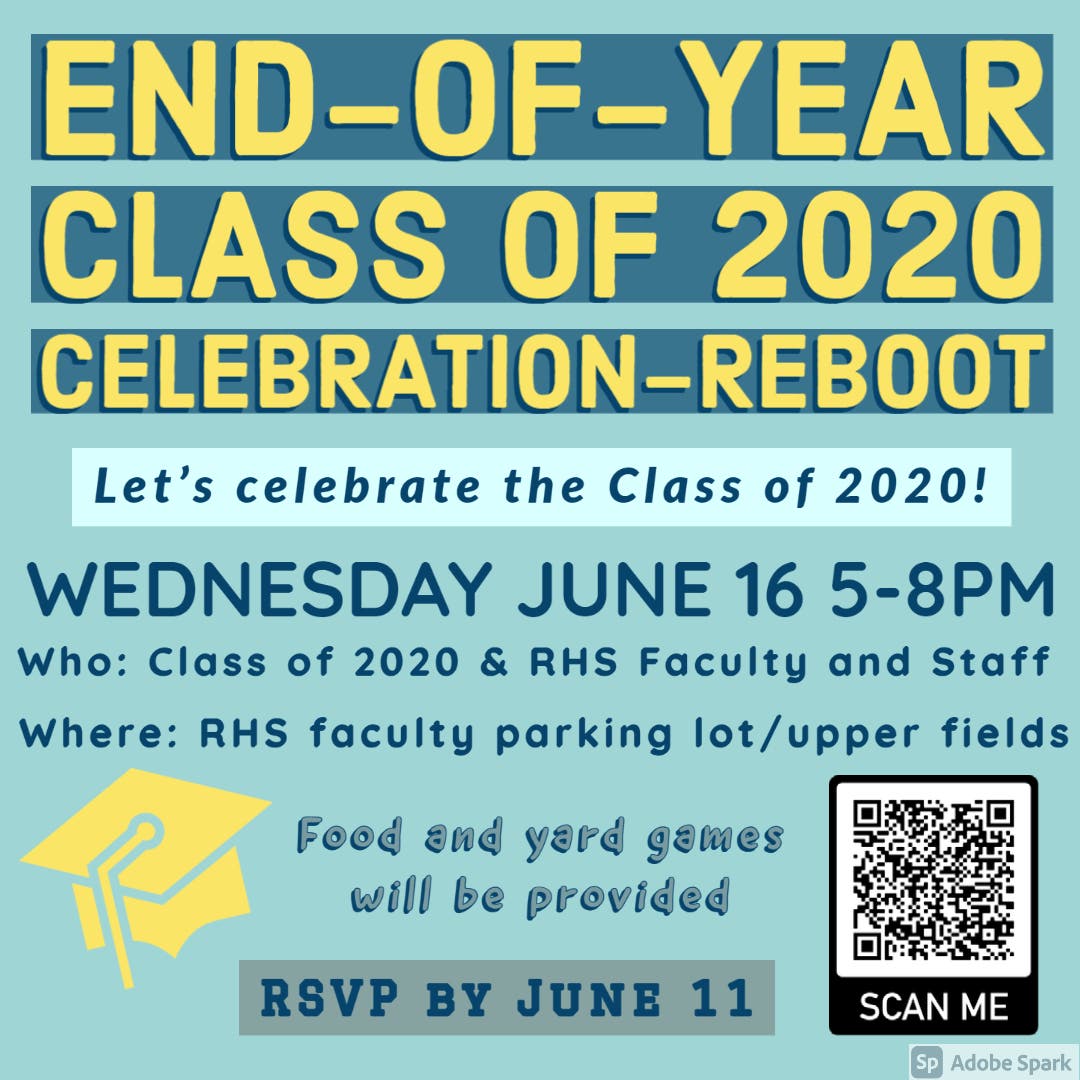 An RHS "End-of-Year Class of 2020 Celebration-Reboot" has been scheduled for June 16 from 5 to 8 p.m. for the members of last year's graduating class and the RHS faculty and staff. The event will be staged at the school's faculty parking lot and the upper athletic fields.