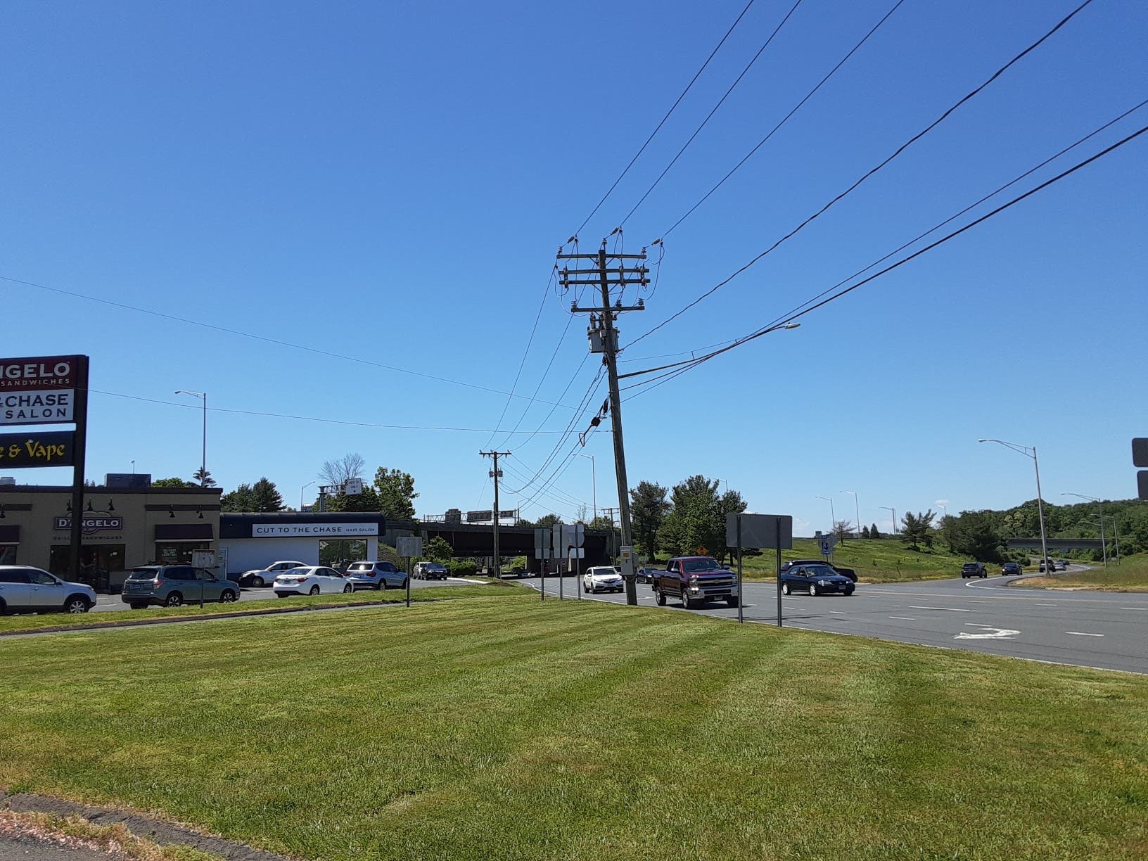 It's hard to recreate the photo in 2021 because of tall trees, the overpass and the seeming six zillion cars that travel through the spot each day, but here's an attempt. The water tower is visible to the squinting eye, just above the stores on the left.