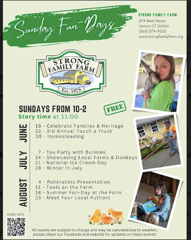 Established in 1878, the Strong Family Farm is Vernon’s historic small family farm located at 274 West Street, Vernon Center, CT. As a 501(c)3 nonprofit, the farm provides a historic agricultural education center where all visiting can experience an authentic family farm environment – preserving the farm for all to enjoy.