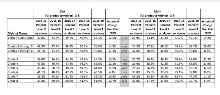 - Using the same student achievement model over a four-year period, the state average increased 0.1 percent in ELA and 8.5 percent in math, while Vernon public schools increased 12.5 perecent in ELA and 19.2 percent in math.