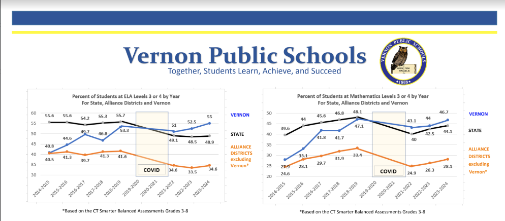"Since the 2018-2019 school year, the statewide average of students reaching grade level expectations has declined, while in Vernon the number of students who have reached or exceeded the standards has steadily increased and is well ahead of that state average," Testa said.