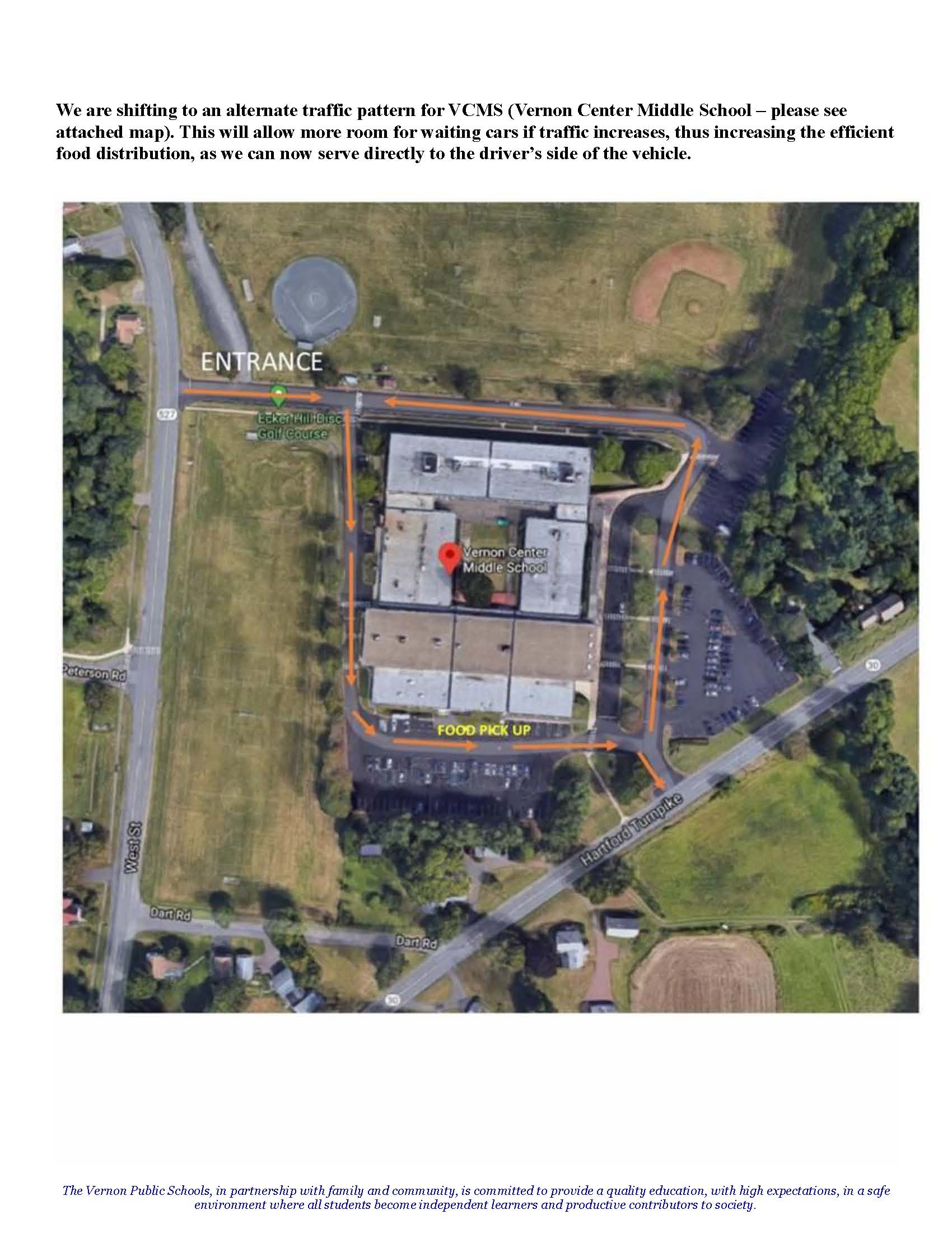 Beginning Thursday, those wishing to pick up meals should enter the Vernon Center Middle School campus via the rear driveway off West Street. Vehicles will be direted to the right, up the wrong way along the rear of the school building and to the side parking lot. The pickup tent will be located in the same area and cars will exit via the main driveway.