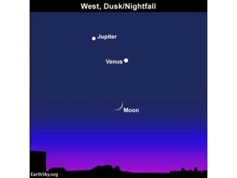 If you plan to catch the glorious threesome, watch after the sunset tonight (Friday), because they will appear to slip below the horizon by early to mid evening. The crescent moon sets first, followed by Venus and Jupiter.