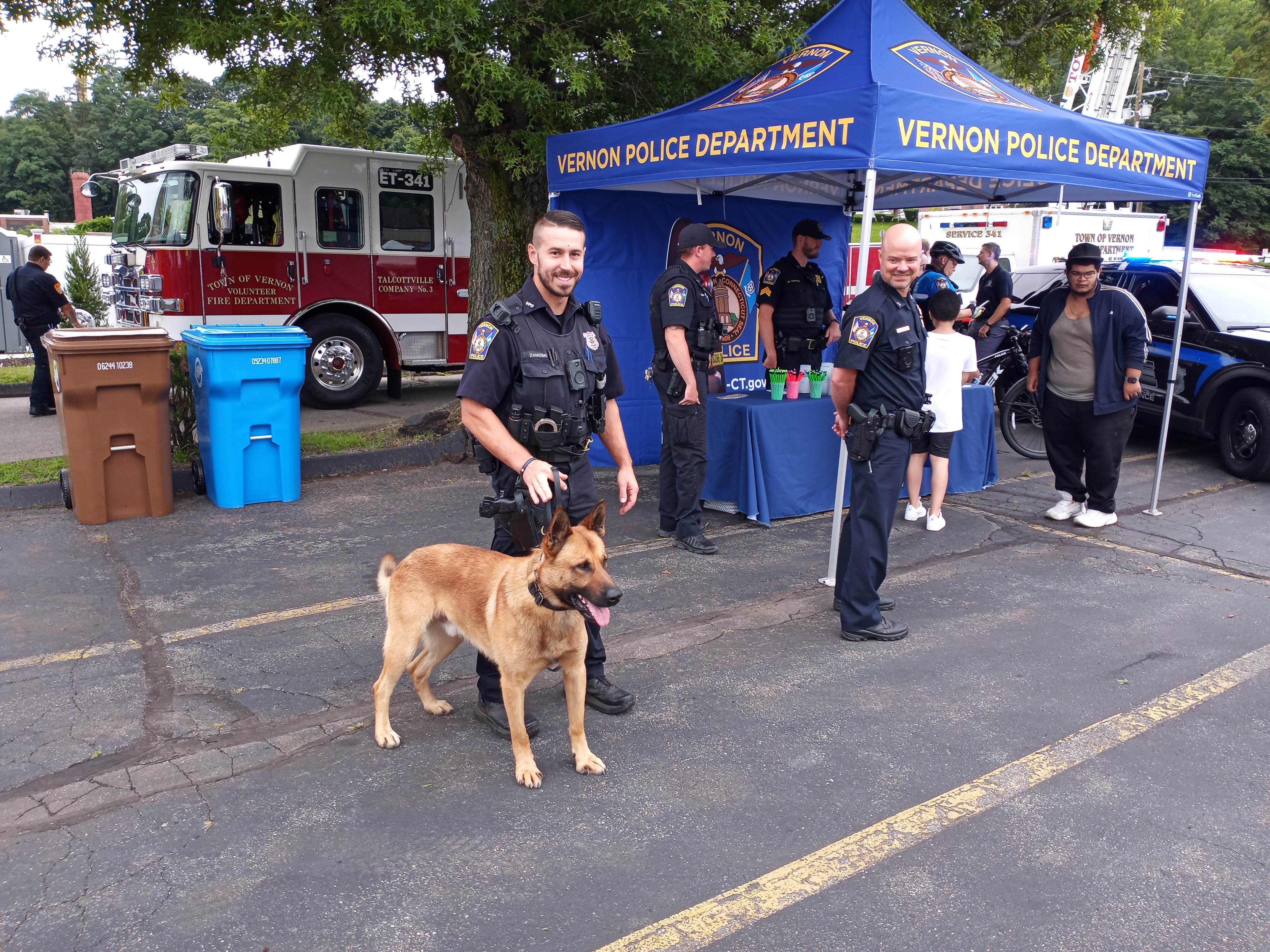 National Night Out was created as a chance for local police departments to interact with the citizenry on a summer evening and that's exactly what happened. It was Chief Marc Petruzzi's first event at the helm in Vernon. Canine Franco was posing for photos and officers were mingling and even serving up some food.