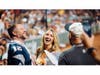 The bride was comfortably dressed in a gray tank top and the groom was wearing a blue Patriots Tom Brady jersey, smartly complimented by a gray tie, matching the trim on the shirt.