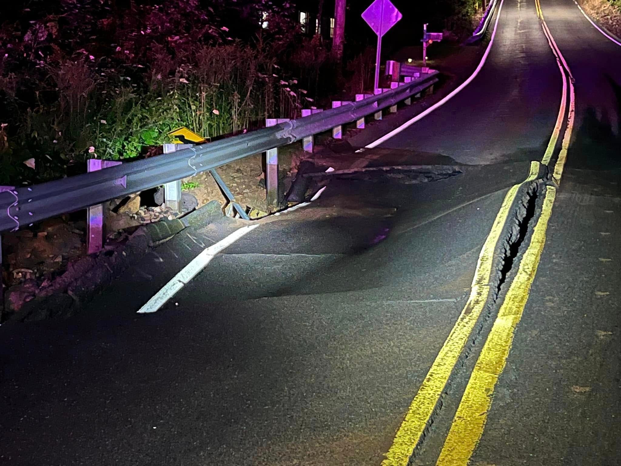 The break not only caused Tunnel Road to buckle, but also toppled the street sign that warns drivers about an upcoming "S" turn.