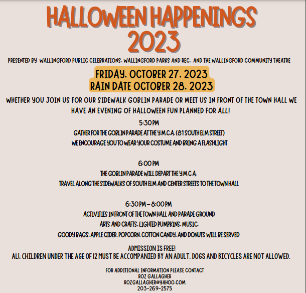 WALLINGFORD, CT — The town’s Happy Halloween Happenings event will take place from 5:30 p.m. to 8 p.m. on Friday, Oct. 27. The rain date is Oct. 28.