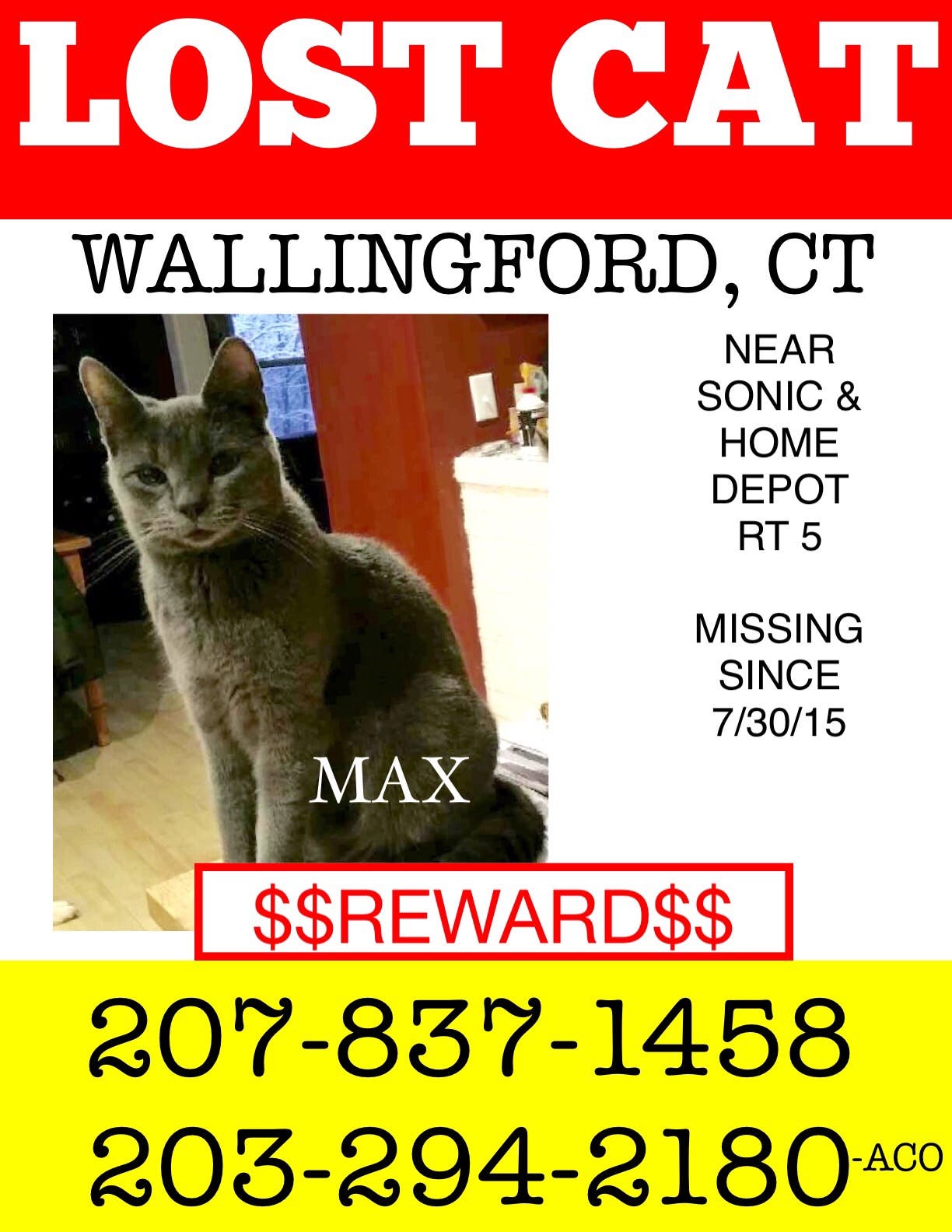 Max is missing &’'his family is worried sick. Please call immediately if you see Max. He's a grey cat. Reward for his safe return.