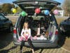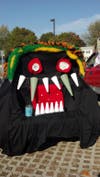Another monster-faced car, designed by Shannon Quinn, featured feather boa for hair, spiral printed felt circles for eyes and tongue, and a top and bottom row of cone-shaped floral styrofoam for teeth. Quinn's piece finished in third place in the contest for best decorated trunk. Stacey Wielachowski's design with full sized zombies won second place.